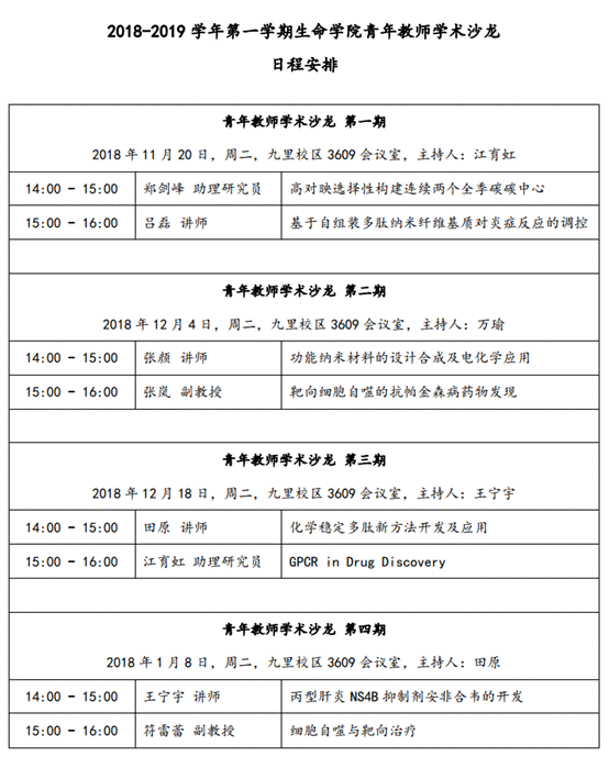 金沙集团1862cc青年教师学术沙龙旨在为青年教师提供一个宽松、自由、平等的学术交流平台。营造自由探究、鼓励学术争鸣、活跃学术思想、促进学科交叉,同时加强生命学院青年教师联系,相互启发,共同进步,碰撞出学术火花。本沙龙定期举办(每期学术沙龙每2周举办一次),每期由两位青年老师做学术报告,邀请学院青年教师及研究生参加,通过自由讨论的形式,鼓励创新,提高青年教师学术水平,促进学院科研工作快速发展。